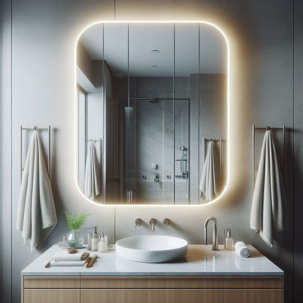 O espelho apresenta um design sofisticado. A moldura fina e elegante se harmoniza perfeitamente com as texturizadas. Ideal para quem busca combinar funcionalidade e estilo no design do banheiro.